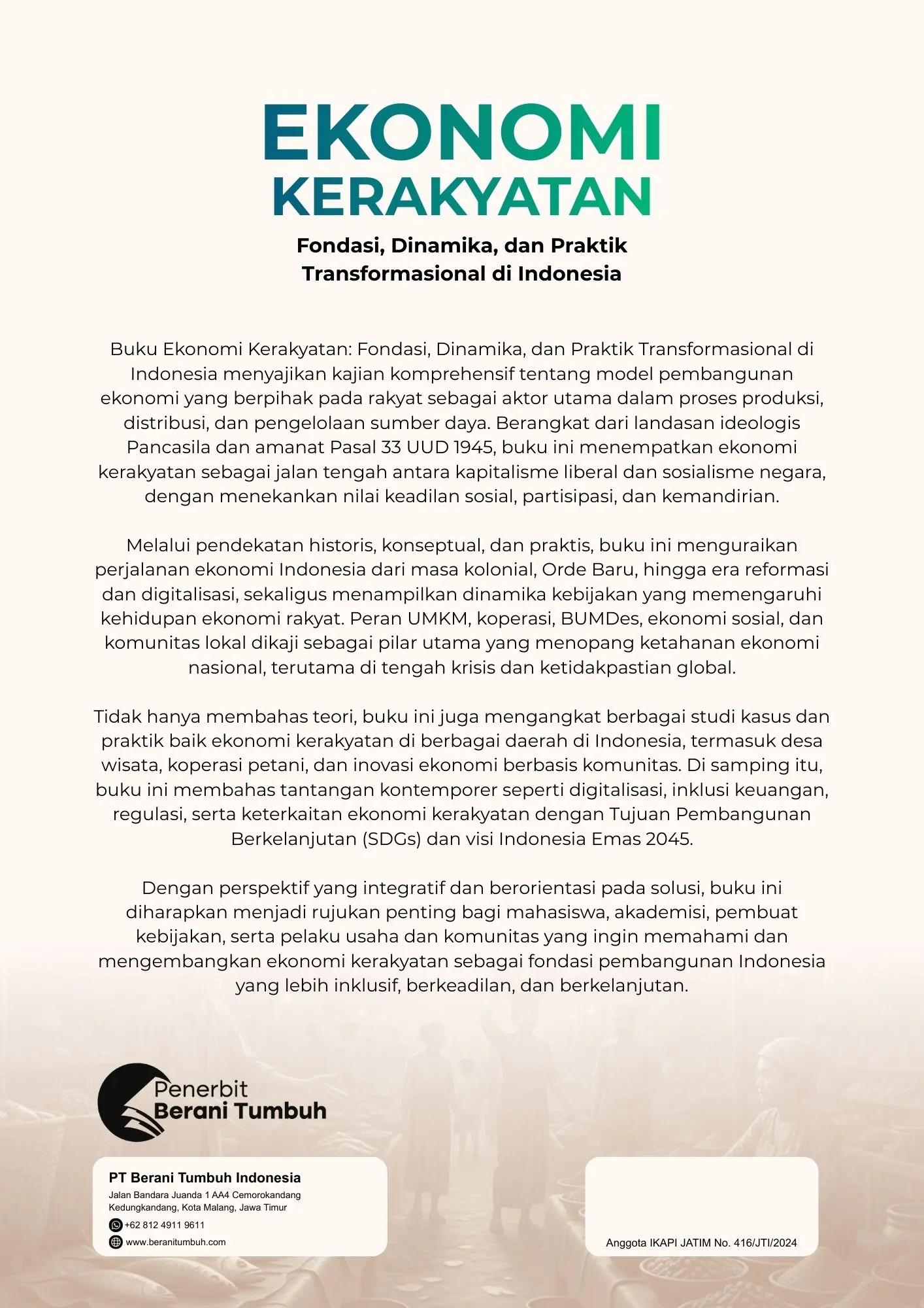 Di tengah dinamika globalisasi, disrupsi teknologi, dan ketimpangan sosial yang kian menguat, ekonomi kerakyatan kembali menemukan relevansinya. Pandemi, krisis ekonomi, dan tekanan pasar global telah menunjukkan bahwa kekuatan ekonomi nasional tidak hanya bertumpu pada korporasi besar dan investasi modal, tetapi justru pada daya tahan, kreativitas, dan kemandirian ekonomi rakyat—melalui UMKM, koperasi, BUMDes, serta berbagai inisiatif ekonomi berbasis komunitas. Oleh karena itu, buku ini dihadirkan untuk memperkuat pemahaman teoretis sekaligus menyajikan praktik-praktik nyata ekonomi kerakyatan dalam konteks Indonesia kontemporer.