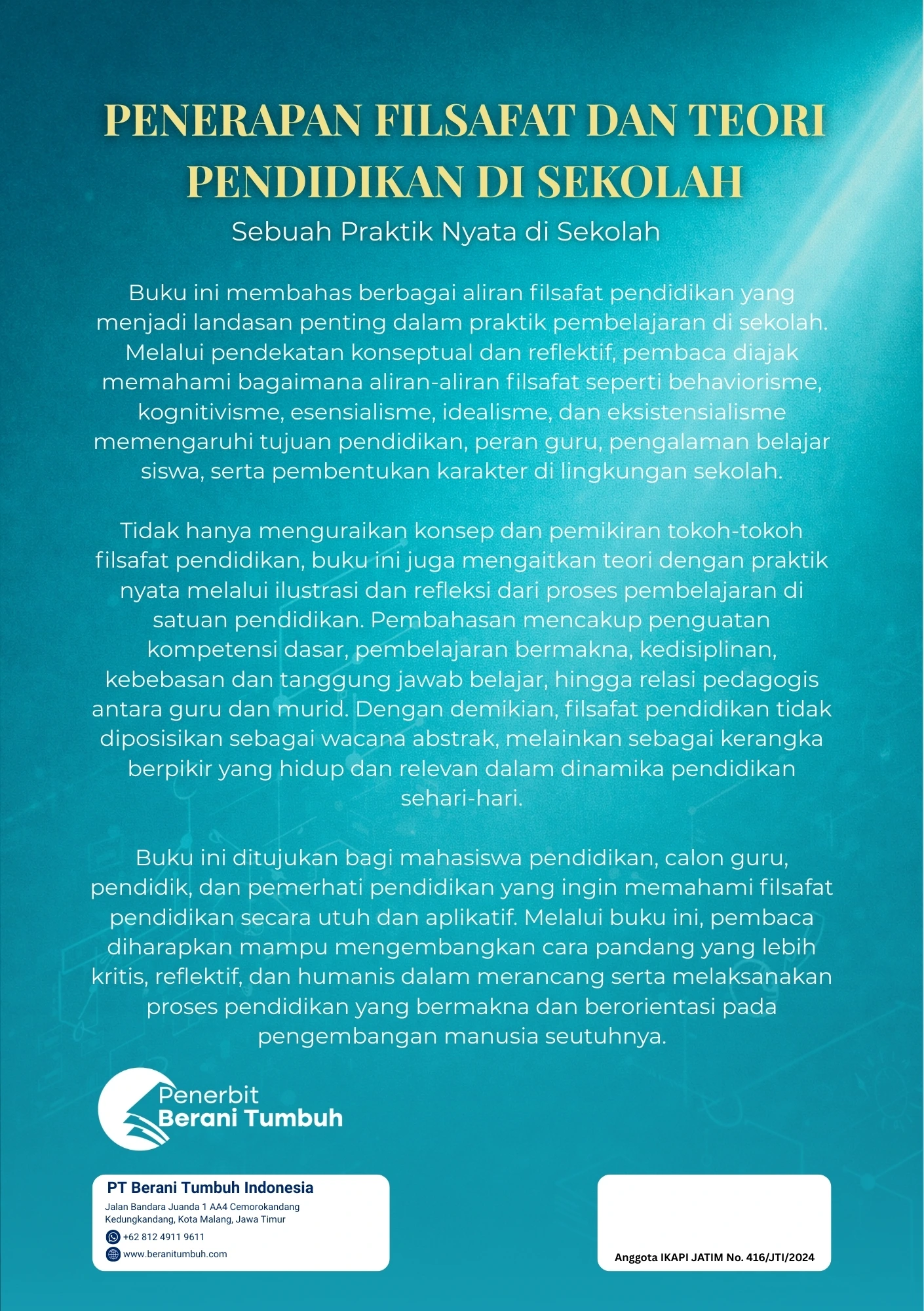 Buku ini ditujukan bagi mahasiswa pendidikan, calon guru, pendidik, dan pemerhati pendidikan yang ingin memahami filsafat pendidikan secara utuh dan aplikatif. Melalui buku ini, pembaca diharapkan mampu mengembangkan cara pandang yang lebih kritis, reflektif, dan humanis dalam merancang serta melaksanakan proses pendidikan yang bermakna dan berorientasi pada pengembangan manusia seutuhnya.